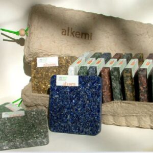 Alkemi può essere riciclato all’infinito e viene prodotto in lastre abbastanza grandi, da permettere una visiva continuità e dallo spessore di 13 mm (con l’opzione di 19 mm per l’Alkemi poliestere).
