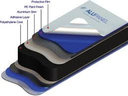 Il pannello ALUPANEL è costituito da un primo strato di pellicola protettiva; seguono una finitura in vernice PE, un rivestimento in alluminio, uno strato adesivo e infine il nucleo di polietilene.