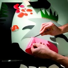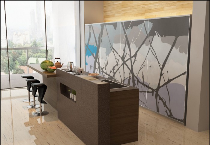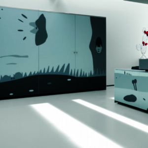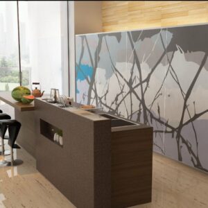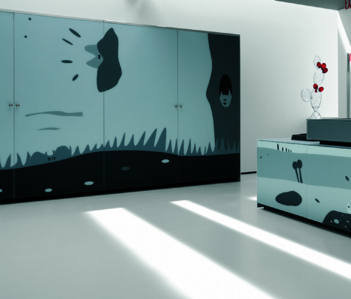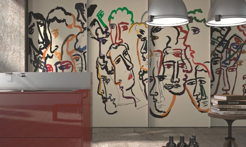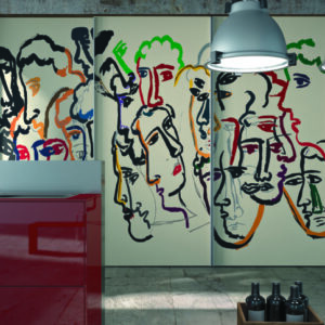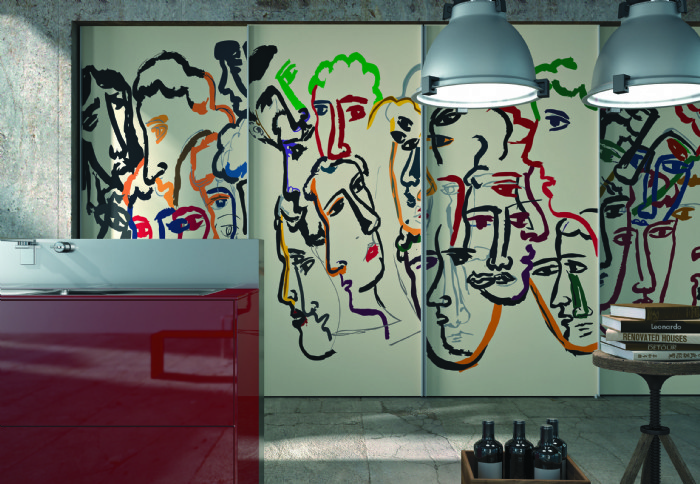 Si tratta di una tecnica recente con la quale viene eseguito un lavoro di intarsio su vetri temperati opachi o lucidi intervenendo su speciali pellicole poste sul retro del vetro. Con questa tecnica, disegni realizzati dal committente oppure opere di autori famosi, possono essere riprodotti su ante in vetro per mobili da soggiorno, da cucina o bagno ma anche su piani di tavolo o direttamente su pannelli di vetro applicati alla parete come quadri. E’ impagabile la soddisfazione di vedere un disegno del proprio figlio o figlia riportato sull’armadio della propria cucina oppure semplicemente una frase a cui teniamo particolarmente o lo skyline della propria città’ ecc. Naturalmente per utilizzare questa innovativa tecnica non solo ci deve essere l’artigiano in grado di eseguire l’intarsio su vetro ma anche una industria capace di progettare e realizzare l’intera esecuzione dell’opera. Il vetro va infatti temperato e applicato su un telaio tecnologicamente molto avanzato che non preveda l’uso di perni per il fissaggio e scompaia dietro l’opera che potrà comprendere più ante accostate. Le ante poi devono essere in grado di sopportare le infinite aperture a cui può essere soggetta un’anta per cucina.