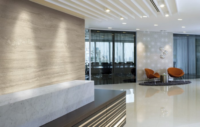 La scala di decori è ampia: dal soluzione tendente al grigio traslucida, calda e morbida allo stesso tempo e con venature che tendono al bianco, alla soluzione che ricorda il bellissimo motivo della pietra esotica, di grande scala, interrotto da raffinate strutture cristalline di quarzo o ancora a quella che riproduce fedelmente il travertino.