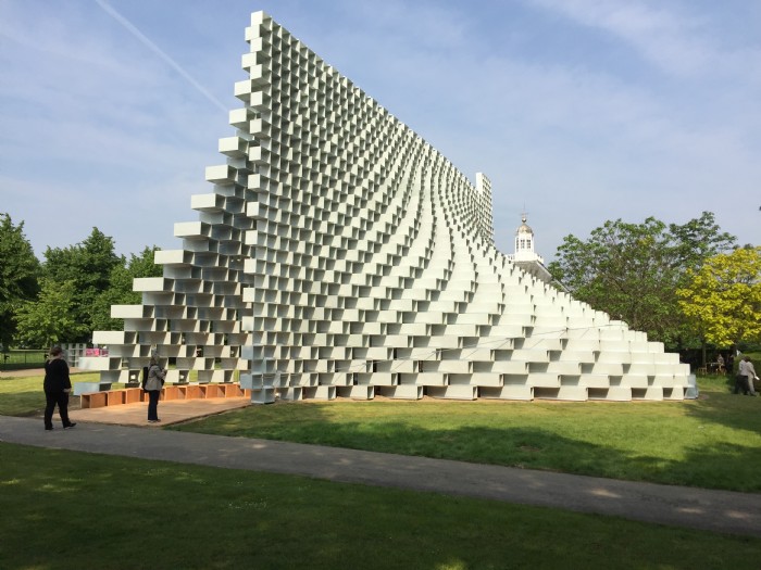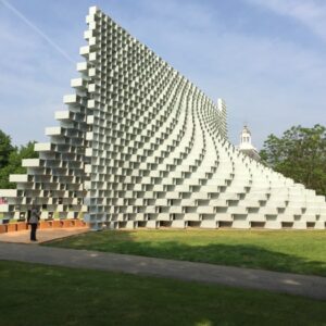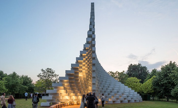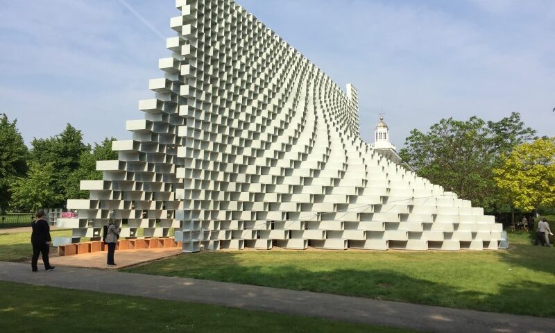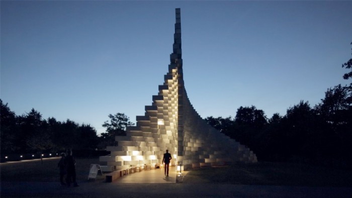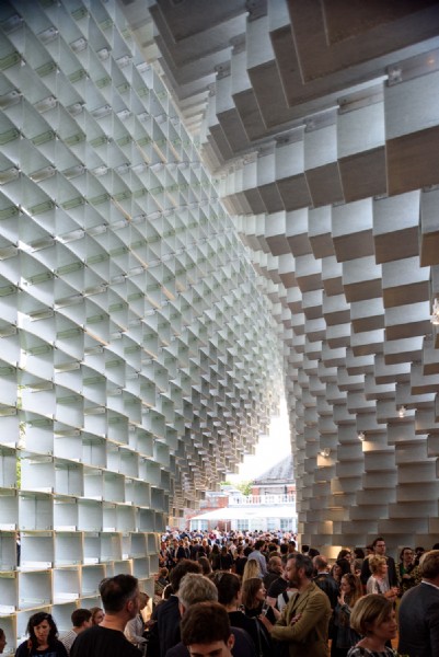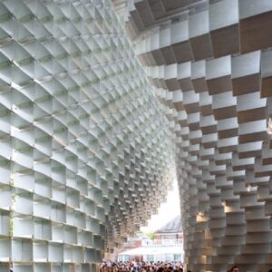 Fondamentale in questa architettura è il senso di apertura. Nel padiglione questo è ottenuto dal sistema a parete, che è costituito da blocchi di legno prefabbricati assemblati in moduli triangolari con piccole aperture. Questo dà una leggerezza e trasparenza al recinto dell’edificio. La composizione delle pareti curve è divisa in quattro elementi, creando quattro diversi punti di accesso al padiglione che permettono all’aria di circolare liberamente.
