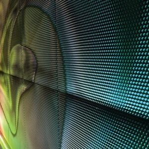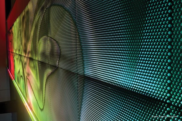 Il risultato è una superficie attiva sensoriale: un’immagine dinamica che si trasforma con il movimento dello spettatore e le variazioni di livelli di luce.